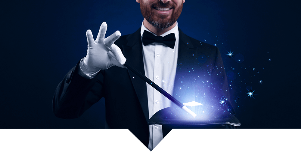 Magician in a tuxedo holding a wand with magic coming from a top hat